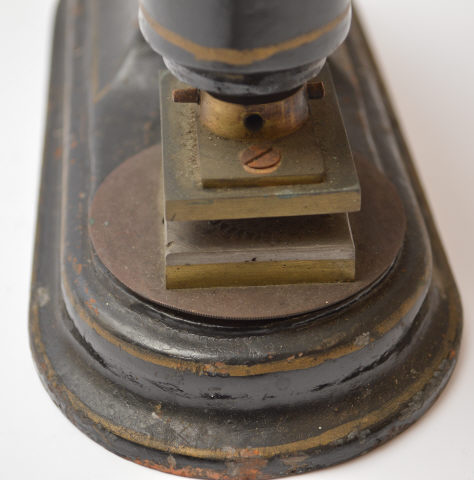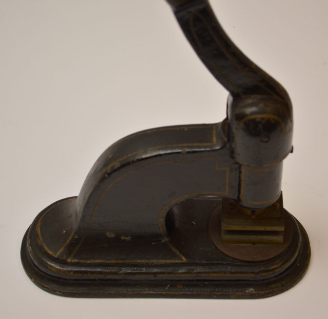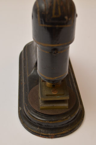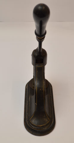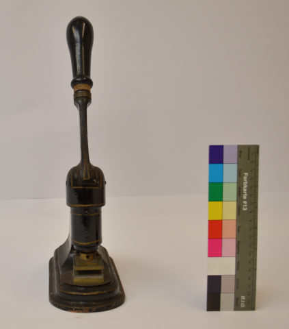 O selo branco que fica gravado é composto pelo emblema da A.N.T., com a inscrição "ASSISTÊNCIA NACIONAL AOS TUBERCULOSOS", em cima. | | | | Designação | - Prensa de selo branco | | | | Colecção | - Tuberculose | | | | Categoria | - Outros equipamentos e utensílios de apoio | | | | Medida | - 25 cm Comprimento - 10,5 cm Largura - 38 cm Altura | | | | Material | - Metal\Ferro - Madeira [Manípulo] | | | | Proveniência | - Transferência | ANT Delegação de Portalegre - Transferência | Instituto de Assistência Nacional aos Tuberculosos (I.A.N.T.) | | | | Entidade | - Instituto Nacional de Saúde Doutor Ricardo Jorge | | |