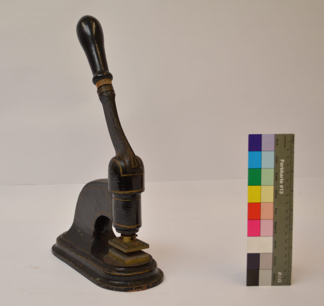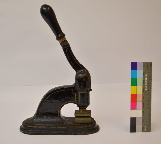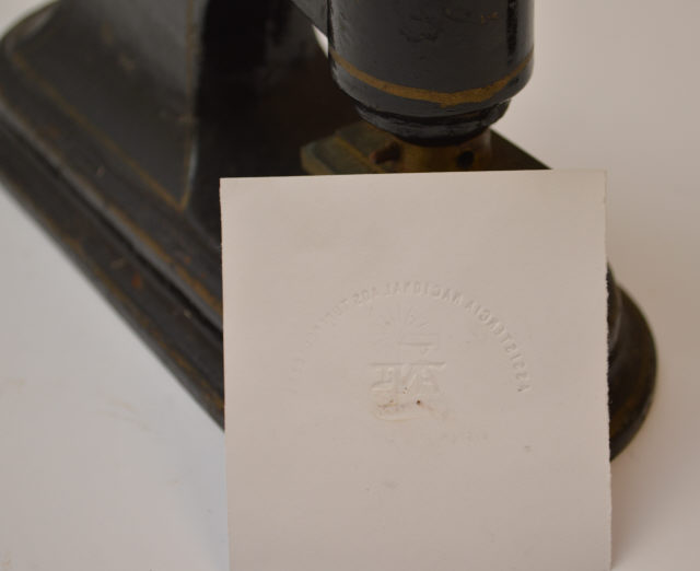 | N.º inventário | - MS.01199 | | | | Descrição | - Prensa de selo branco portátil, de ferro, com manípulo em madeira e com esquadria pintada à mão. A prensa é constituída por um cunho e um contracunho articulados e, ao ser manipulada, comprime o "selo branco" no papel.