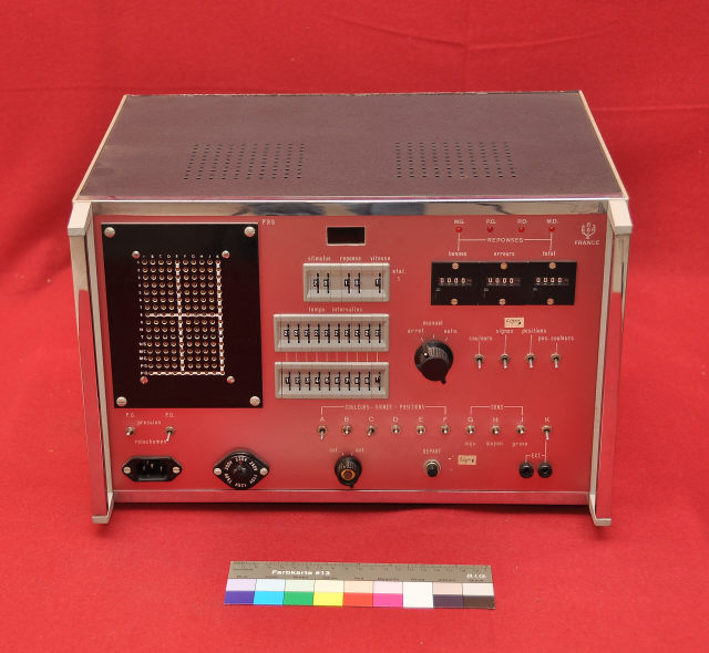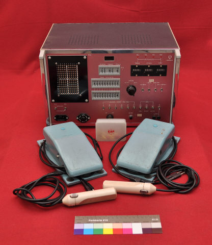 | N.º inventário | - MS.00276 | | | | Descrição | - Polli-reaciómetro, aparelho constituído por cinco peças, que inclui um conjunto de pedais azuis e um de manípulos brancos, utilizado para testar estímulos visuais e auditivos, emitidos automaticamente. As reacções do sujeito são indicadas no cronoscópio e os erros registados no contador presente na caixa quadrangular. | | | | Designação | - Poli-reaciómetro | | | | Autoria | - Ets. Pierre Dufour [Distribuidor] | | | | Cronologia | - Século XX | | | | Colecção | - Camilo Cardoso | | | | Categoria | - Instrumentos, aparelhos e equipamentos médico-cirúrgicos | | | | Origem | - França | | | | Medida | - 29 cm Altura [Aparelho] - 44 cm Largura [Aparelho] - 37 cm Profundidade [Aparelho] - 175 cm Comprimento [Fio eléctrico do aparelho] - 9 cm Altura [Pedal] - 12 cm Largura [Pedal] - 3 cm Altura [Manípulo] - 3,5 cm Largura [Manípulo] - 14 cm Profundidade [Manípulo] - 170 cm Comprimento [Fio eléctrico do manípulo] | | | | Material | - Polímero (plástico) - Metal | | | | Proveniência | - Doação | Faculdade de Ciências Médicas da Universidade Nova de Lisboa | | | | Entidade | - Instituto Nacional de Saúde Doutor Ricardo Jorge | | |